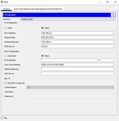d. Connect to the FastEthernet port of PCB to R1 G0/0/0.