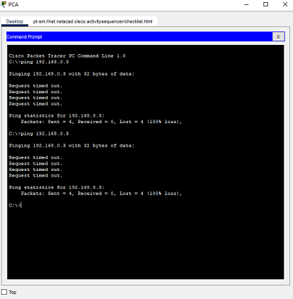 In the PCA Command Prompt, enter the ping 192.168.0.3 command. You can also open the PCB Command Prompt, and then enter the ping 192.168.1.3 command.